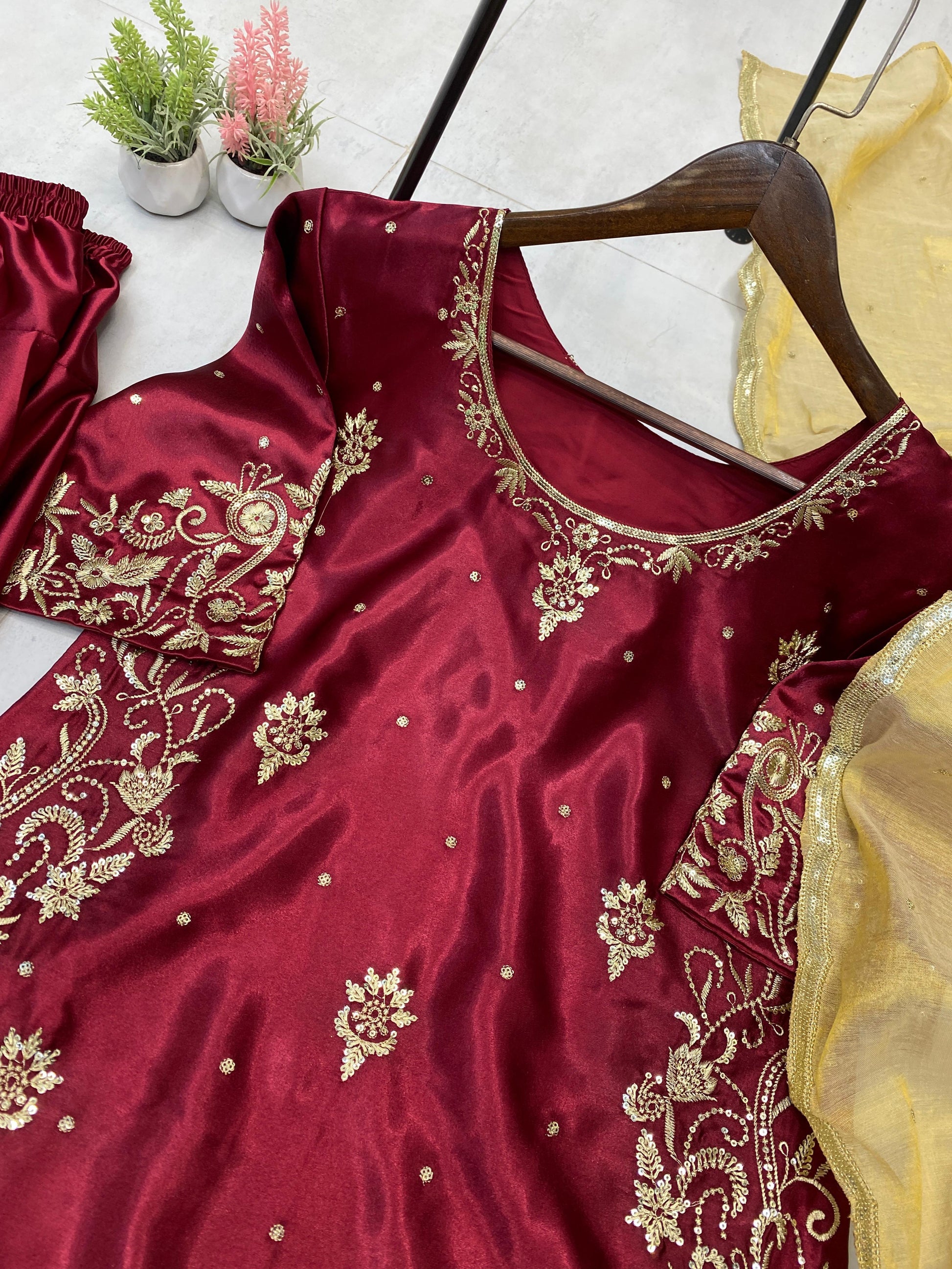 Glorious Maroon Satin Sequence Work Sharara Suit